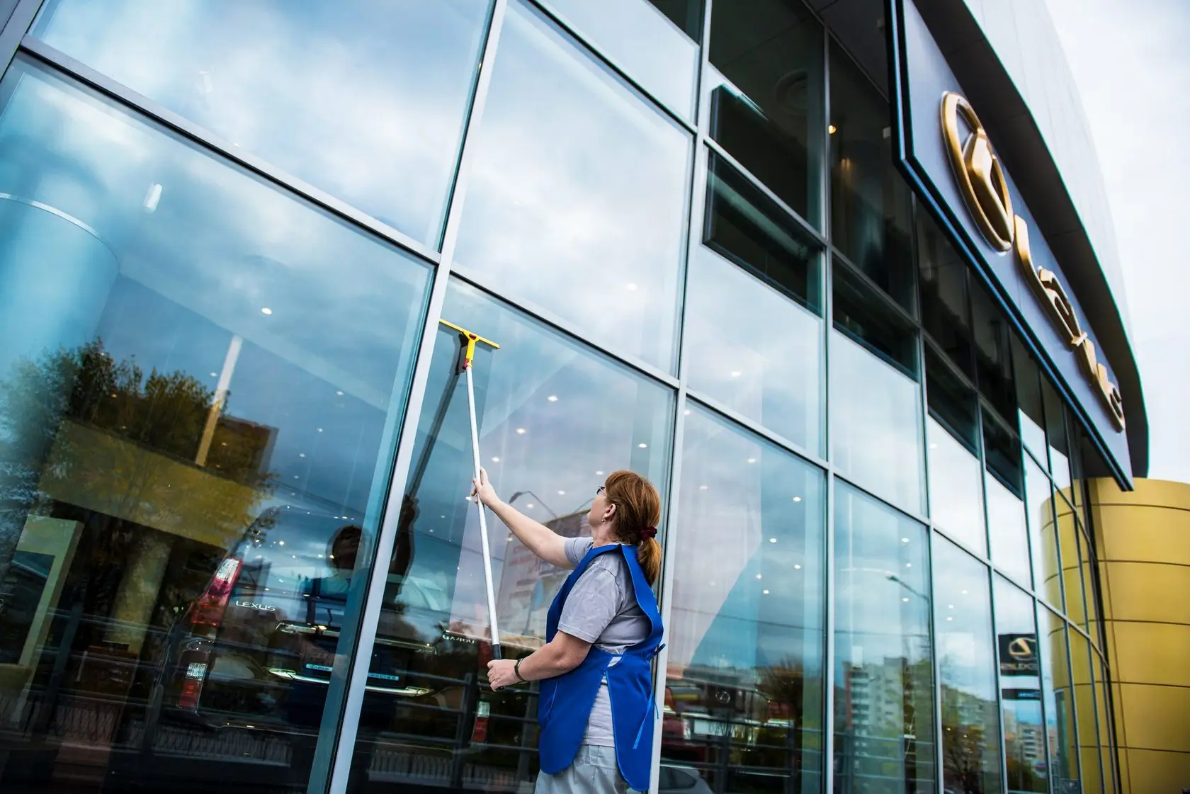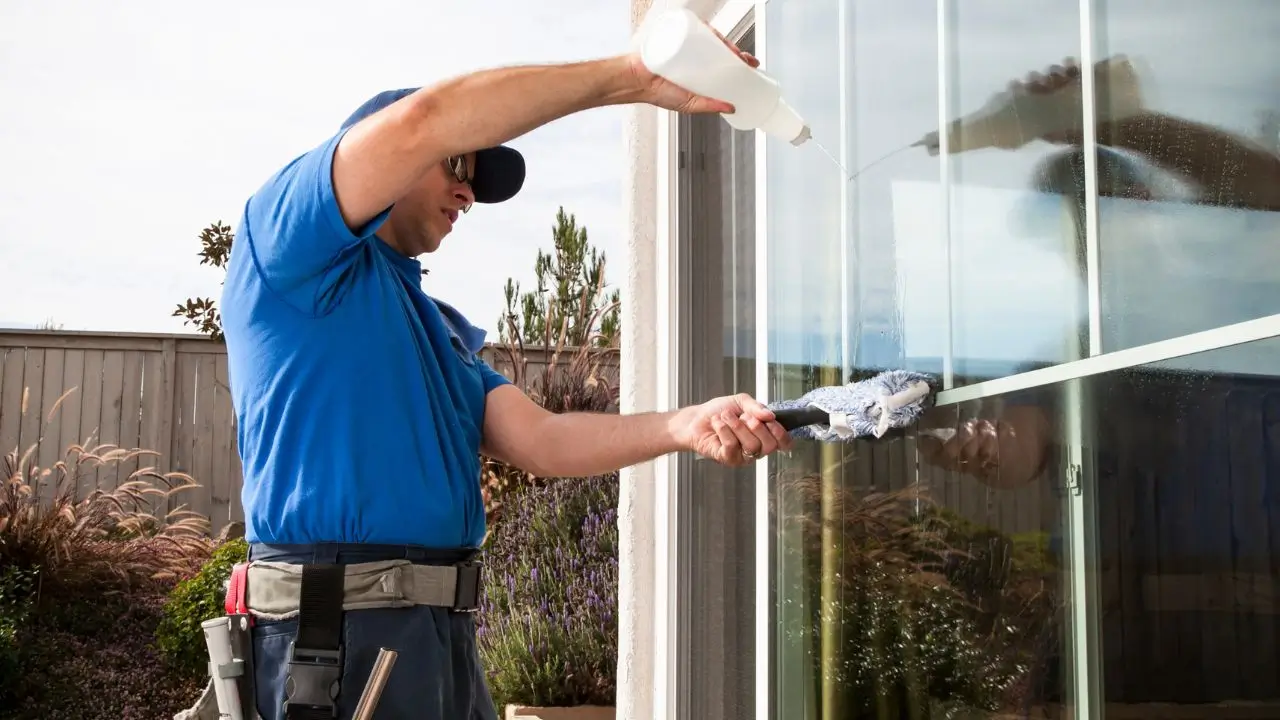 A soapy solution is applied to the glass using a T-bar applicator and a microfiber cloth. Also, stubborn spots like stickers, bird droppings, or paint are cleaned by a professional glass scraper.